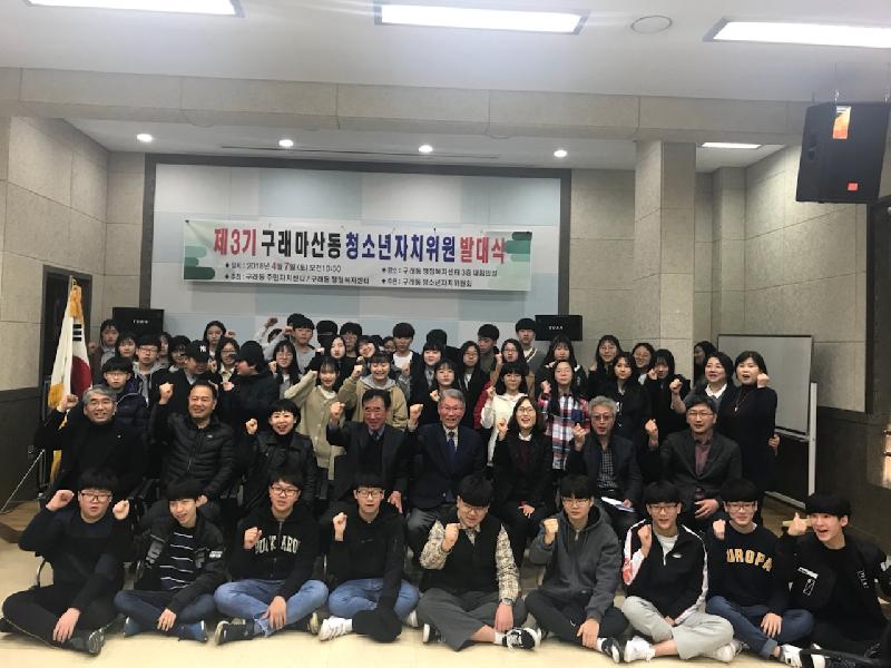 구래동 주민자치위원회(위원장 김윤수)가 지난 7일 구래동 주민센터 3층 대회의실에서 주민자치위원, 학생 및 학부모 등 60여명이 참석한 가운데 제3기 구래동 청소년자치위원회 발대식을 개최했다.