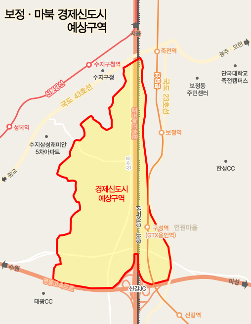 경제신도시 조성이 추진되는 곳은 경부·영동고속도로의 교차점인 신갈JC부터 풍덕천동 경계에 이르는 구간의 경부고속도로 동·서 양측으로 대부분 농지와 낮은 임야로 구성돼 있다.