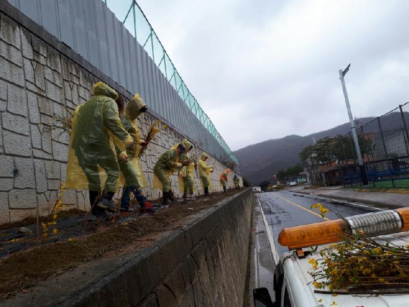 이날 참가자들은 이곳 도로변 133m 구간에서 1000여 그루의 개나리와 철쭉, 담쟁이 등을 심고 장마철에 대비해 배수로 정비 작업도 했다.