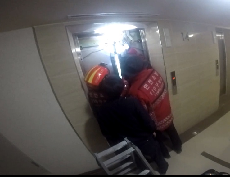 | 승강기에 갇힌 사람 구조 장면.<사진=인천공단소방서 제공> |