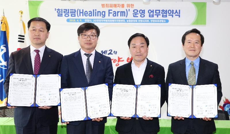 안양시(시장 이필운)는 9일 시청 접견실에서 안양지역범죄피해자 센터, 농협중앙회 안양시지부, 안양보호관찰소와 업무협약을 체결하고 범죄피해자를 위한 힐링팜(Healing Farm) 운영에 힘을 모으기로 했다.