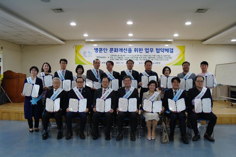 협약식은 부천시보건소와 ▲순천향대학교 부천병원 ▲부천성모병원 ▲세종병원 ▲부천대성병원 ▲다니엘종합병원 ▲부천시립노인전문병원 ▲가은병원 ▲부천요양병원 ▲부천우리병원 ▲서울여성병원 ▲스마튼병원 ▲중동연세병원 ▲큰사랑요양병원 ▲부천시의사회 ▲부천시한의사회 ▲부천시치과의사회 ▲부천시약사회 ▲부천시간호사회가 참석한 가운데 적극적인 협조체계 구축을 통해 병문안 기준 권고안을 실천하여 건강한 부천시 병원문화 정착에 뜻을 모았다.