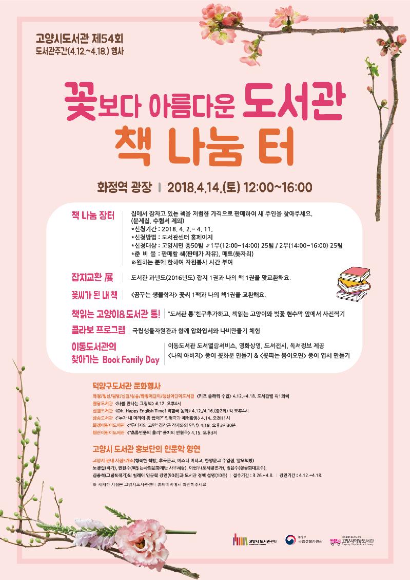 고양시 덕양구도서관은 도서관 주간(4.12.~4.18.)을 기념해 오는 14일(토) 12시부터 오후 4시까지 화정역 광장에서 ‘꽃보다 아름다운 도서관 책 나눔터’를 운영한다.