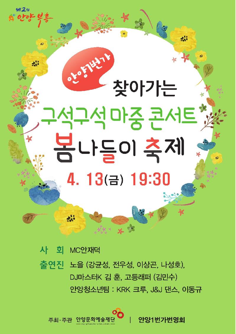 안양시(시장 이필운)는 오는 13일(금) 저녁 7시 30분 안양1번가 차 없는 거리(안양로292번길 일원)에서 ‘안양1번가 봄나들이 축제’를 개최한다.