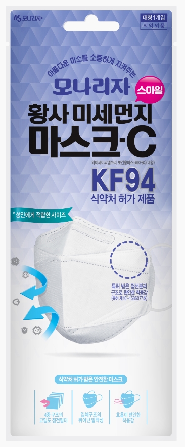 ‘모나리자 스마일 황사미세먼지 마스크 KF94’는 성인용과 어린이용 두 가지 사이즈로 출시돼 얼굴이 작은 아이들도 편리하게 사용할 수 있다. 또한 3단 입체 구조의 넓은 면적과 특허(제10-1586077호) 받은 점선분리구조로 장시간 사용해도 편안한 착용감을 선사하며 평균 크기 0.4㎛의 미세입자를 94%이상 걸러낼 수 있는 KF94 규격으로 차단력까지 한층 업그레이드 됐다.