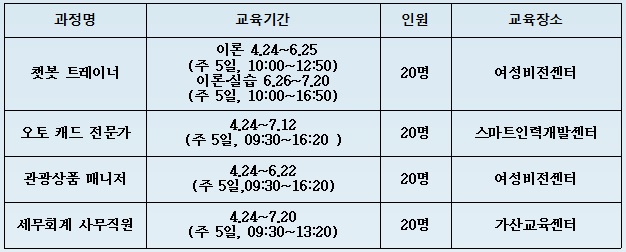 - 챗봇(대화 로봇) 트레이너 양성과정, 오토 캐드 전문가 양성과정, 관광상품 매니저 양성과정, 세무회계 사무직원 양성과정