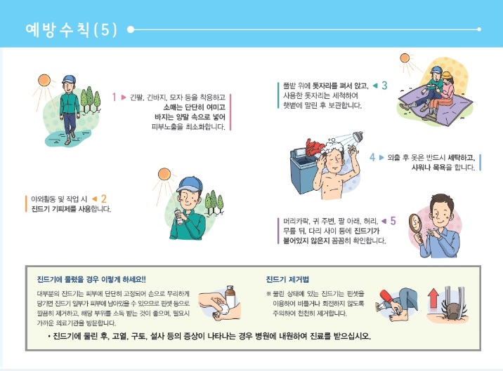 ▲머리카락, 귀 주변, 팔 아래, 허리, 무릎 뒤, 다리 사이 등에 진드기가 붙어 있지 않은지 꼼꼼히 확인하기 등이 있다.