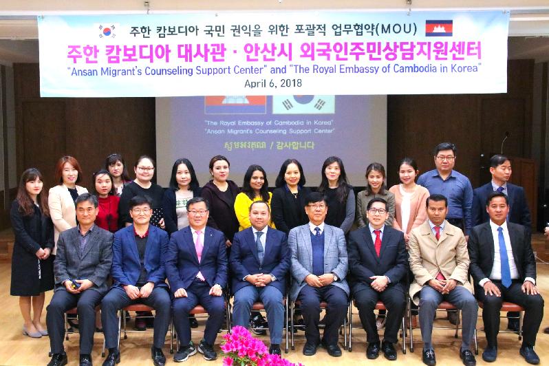 안산시 외국인주민상담지원센터(센터장 이복경)와 주한 캄보디아대사관(대사 롱 디망)은 지난 6일 다문화지원본부 3층 다목적실에서 상호 발전적 협력관계 및 상생발전을 위한 업무협약을 체결했다.