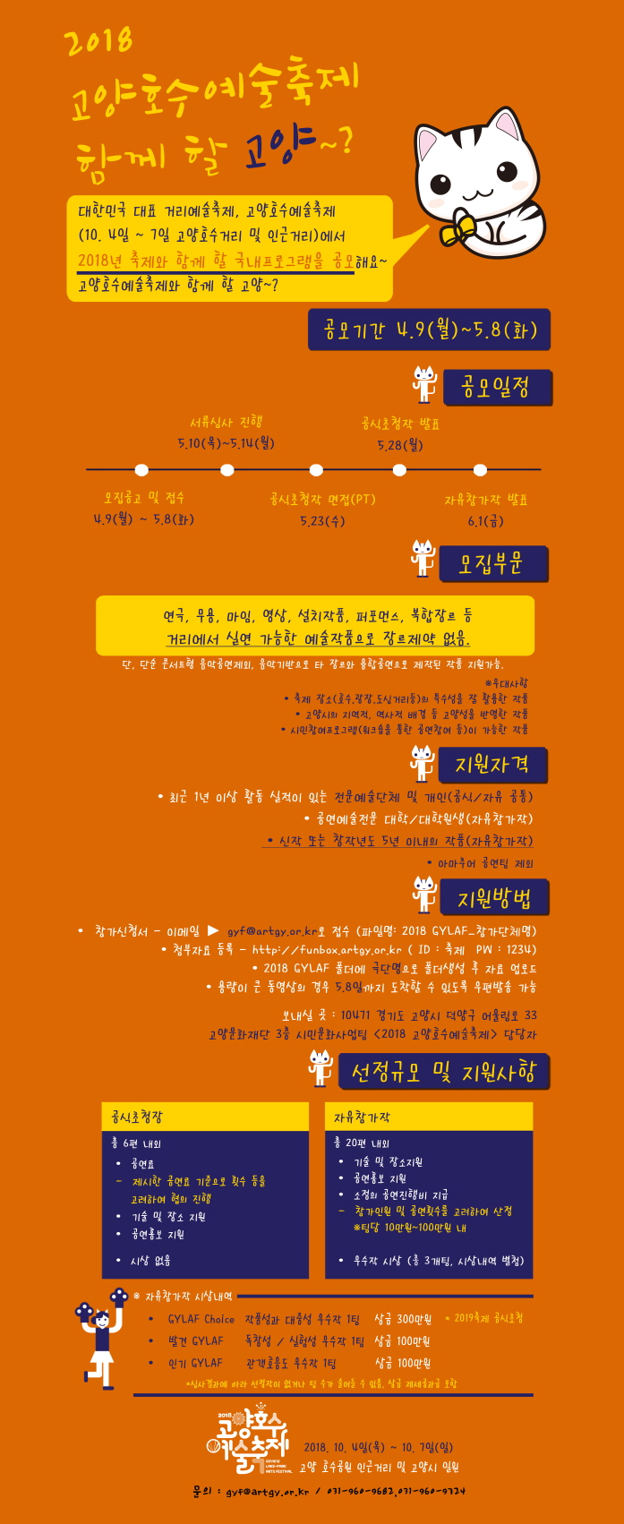 고양문화재단이 오는 10월 고양호수공원에서 개최 예정인 ‘2018 고양호수예술축제(GoYang Lake-park Arts Festival, GYLAF 2018)’에 함께할 거리예술가들을 공모한다.