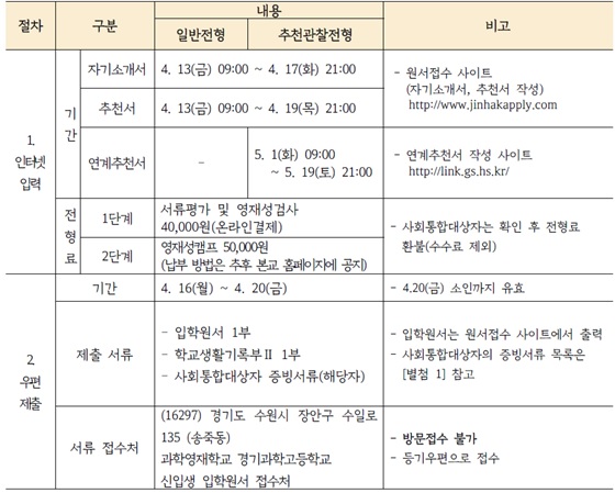 이 밖에 연계추천서(5월 1일부터 19일까지) 인터넷 입력 등 자세한 사항은 ‘경기과학고등학교(https://www.gs.hs.kr)/입학안내’에 탑재된 자료에서 확인할 수 있다.