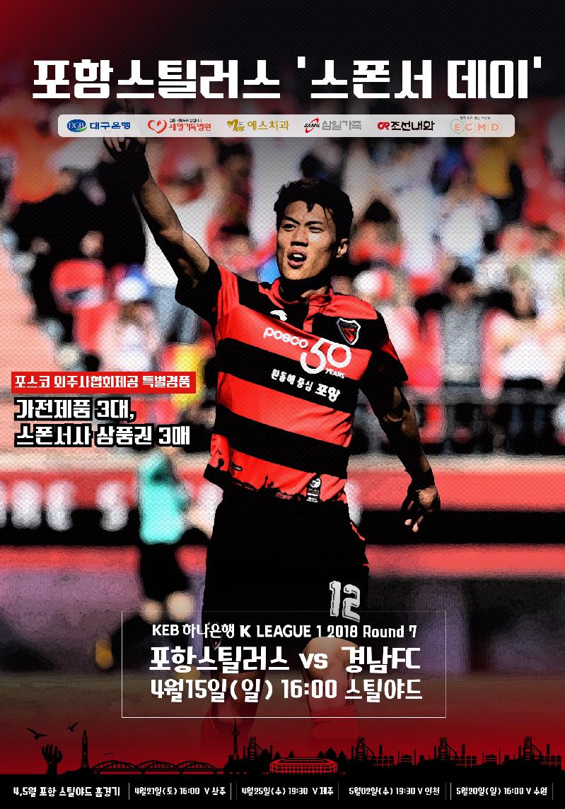 포항스틸러스가 15일(일) 오후 4시 경남을 상대로 KEB하나은행 K리그1 2018 7라운드 홈경기를 치른다.