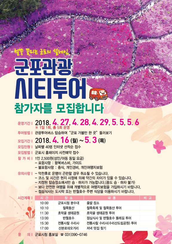 군포시는 ‘2018 군포철쭉축제’의 성공적인 개최를 위해 오는 27일부터 다음달 6일까지 ‘군포철쭉축제’와 철쭉동산을 방문하는 군포시민 및 관광객들을 대상으로 ‘군포관광시티투어’를 운영한다.