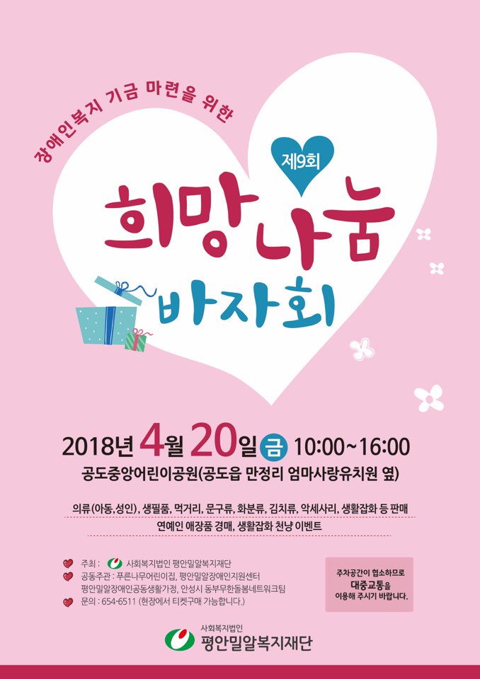 사회복지법인 평안밀알복지재단(대표이사 한덕진)이 주최하고 푸른나무어린이집, 평안밀알장애인지원센터, 평안밀알장애인공동생활가정, 안성시 동부무한돌봄네트워크팀이 공동주관하는 제9회 희망나눔 바자회가 오는 20(금) 오전 10시부터 오후 4시까지 공도중앙어린이공원(경기 안성시 공도읍 만정리)에서 열린다.