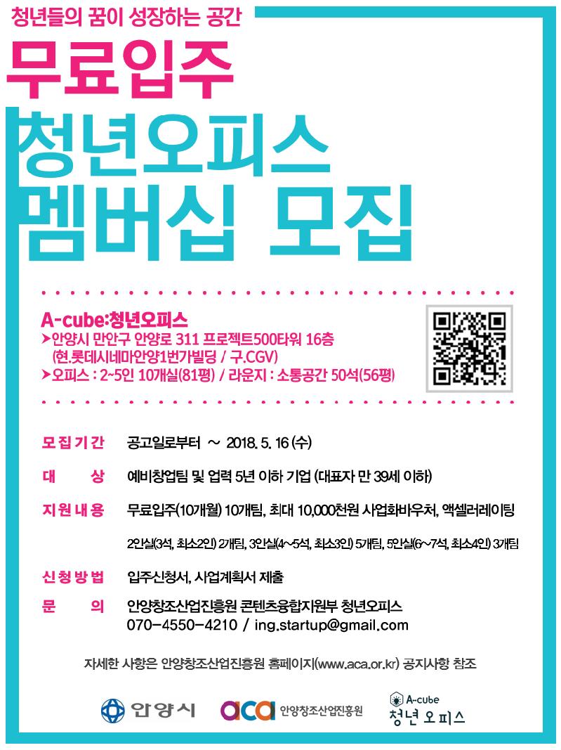 안양시(시장 이필운)는 오는 5월 16일까지 예비창업팀 및 창업 5년 이하의 기업을 대상으로 에이큐브 청년오피스에 입주할 멤버를 모집한다.
