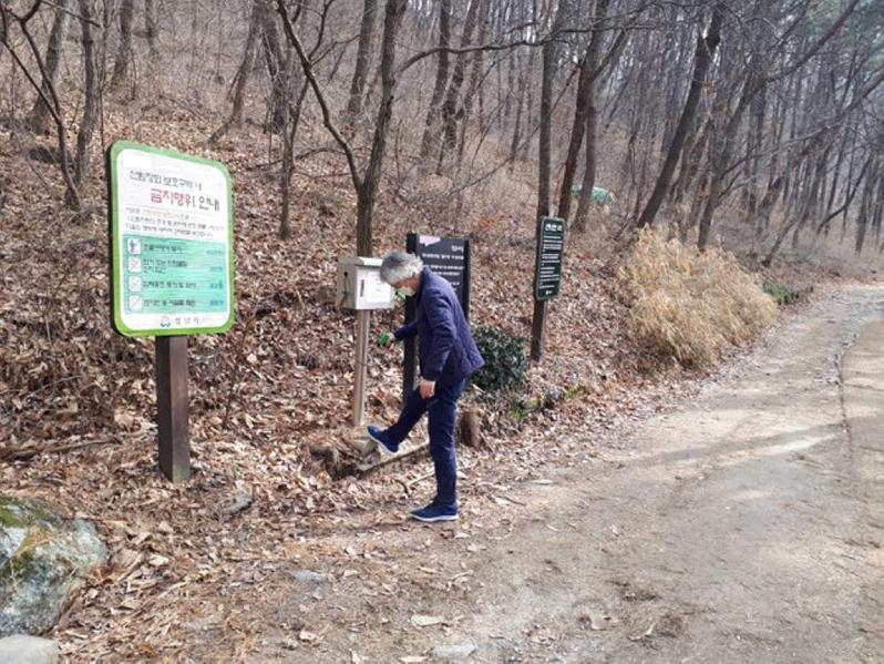 | 청계산 등산로 입구에 설치된 해충기피제 분사 중인 등산객 모습. |