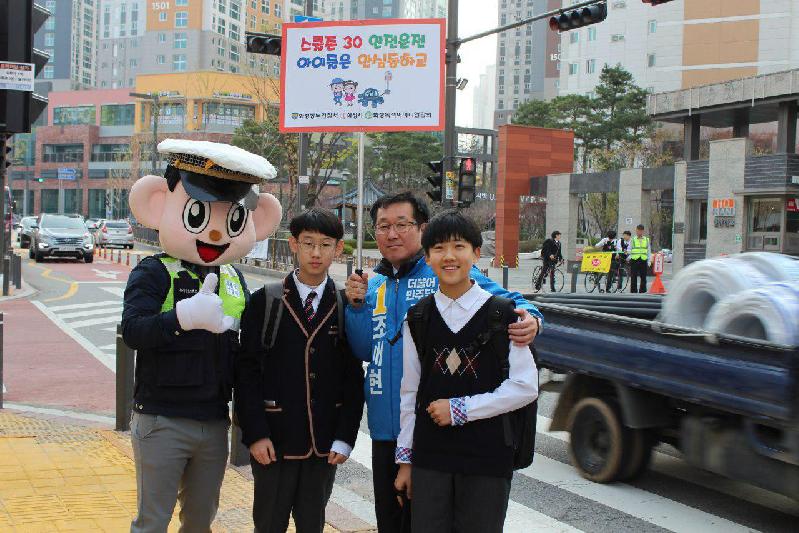 조대현 예비후보는 경찰관계자 및 녹색어머니회와 함께 교통안전 피켓을 들고 등교하는 아이들과 인사를 나눴다.