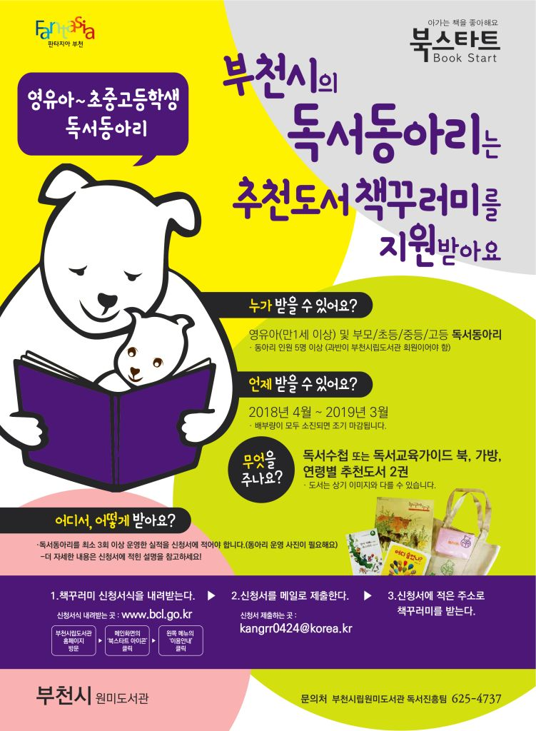부천시의 영유아, 초⋅중⋅고등학생 독서동아리는 4월부터 신청을 통해 연령별 추천도서가 들어있는 북스타트 책꾸러미를 지원받는다.