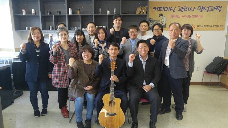 | 커피머신관리사 1급 양성과정 수료생들이 기념촬영을 하고 있다.<사진=부천시청 제공> |