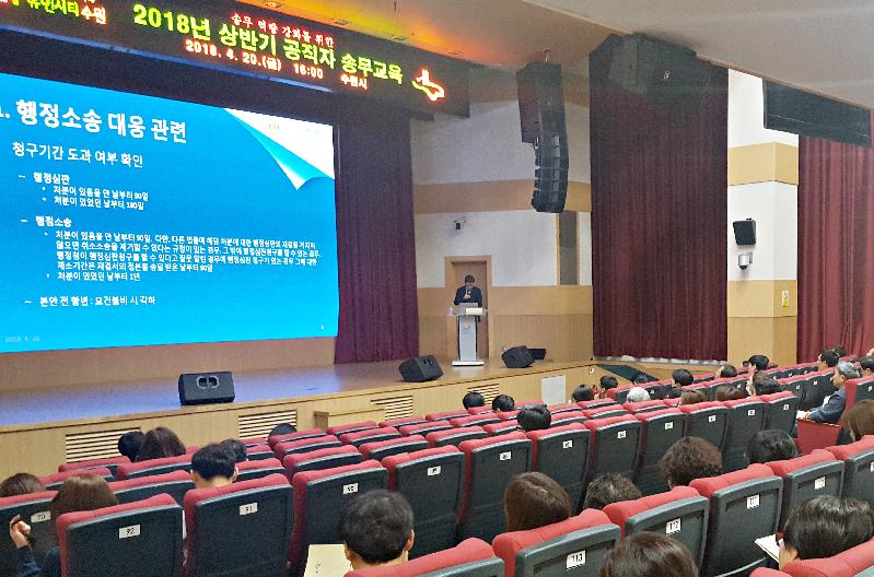 수원시는 20일 시청 대강당에서 소송 실무 담당 공직자 등 100여 명이 참석한 가운데 업무 전문성·역량 강화를 위한 ‘2018 상반기 공직자 송무(訟務)교육’을 진행했다.