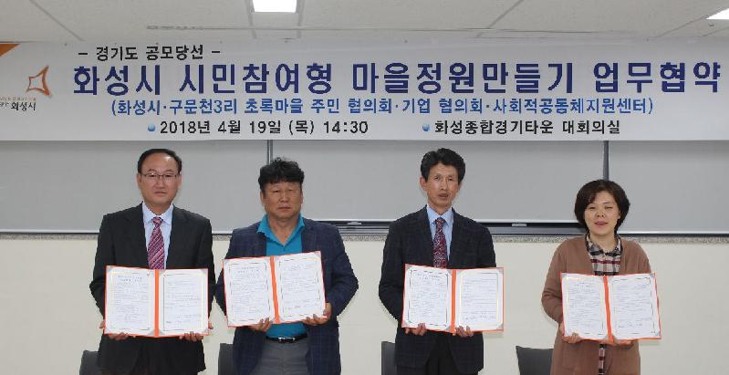 화성시가 경기도 공모사업인 ‘시민참여형 마을정원만들기 사업’의 성공적 추진을 위해 지난 19일 화성종합경기타운 대회의실에서 향남읍 구문천3리 주민 및 기업 협의회, 사회적공동체지원센터와 상호협력 협약을 체결했다.