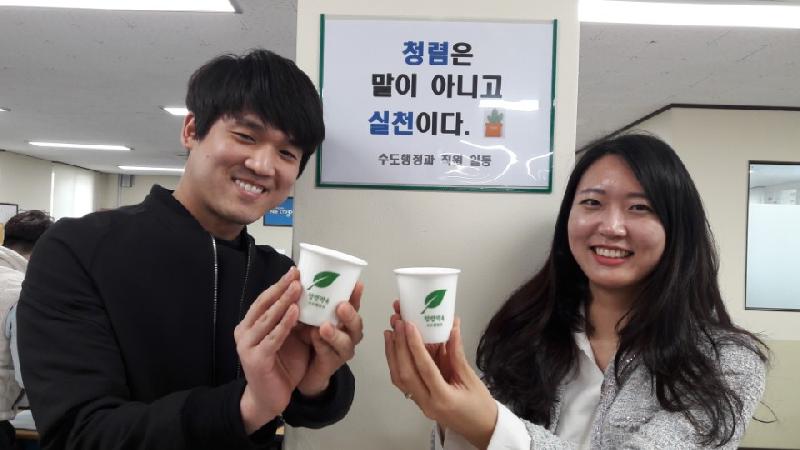 흰색 도자기 재질로 만든‘청렴컵’은 녹색 나뭇잎 문양과 ‘청렴약속’이라는 문구가 새겨져 있다. 직원들이 일상 속 청렴 의지를 재확인할 수 있고 종이컵 사용도 줄여서 환경보호와 예산절약의 효과를 거두기 위한 것이다.