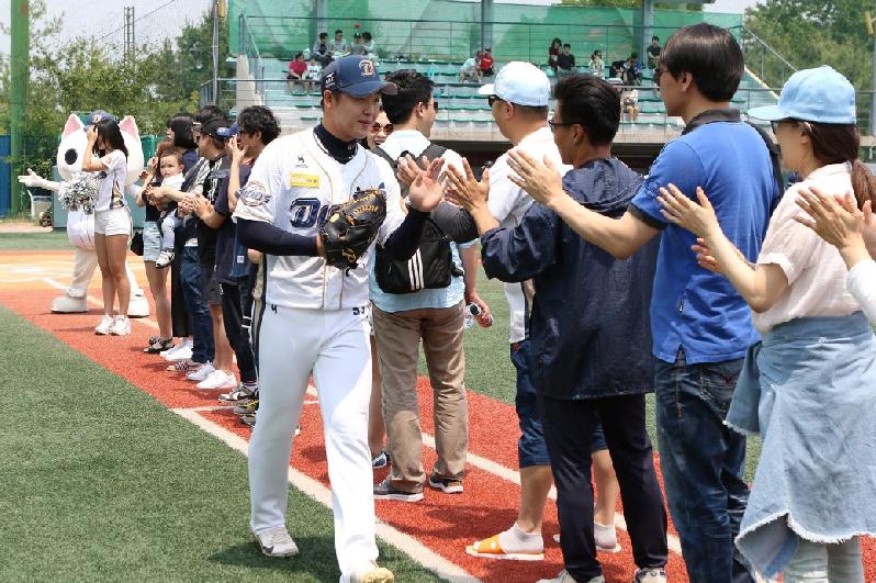 | 고양 다이노스 선수들과 시민들이 경기 후 팬들과 하이파이브를 하며 즐거워하고 있다. |