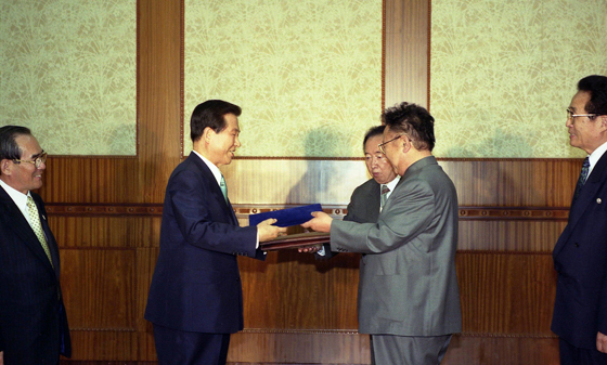 | 김대중 대통령(왼쪽)과 김정일 국방위원장이 2000년 6월 14일 공동서명한 남북공동선언문을 교환하고 있다.<사진= 통일부 제공> |