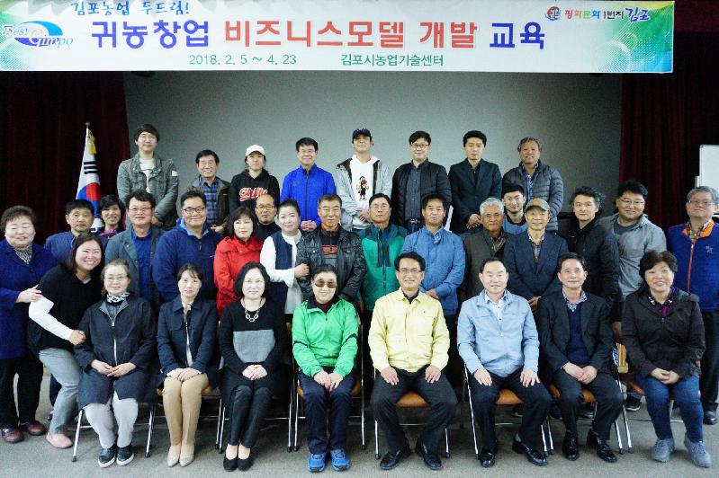김포시농업기술센터(소장 고근홍)는 신규농업인 창업역량 강화, 귀농인 창업설계 지원 등 귀농창업 활성화를 위한 3개월여의 교육을 마무리 하고, 지난 23일『김포농업 두드림! 귀농창업 비즈니스모델 개발 교육』수료식을 가졌다.