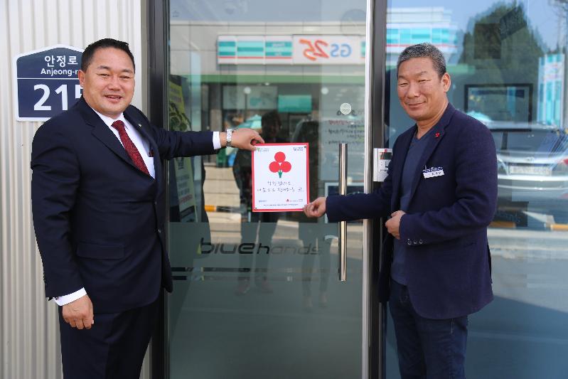 지난 23일 평택시 안정로(팽성읍)에 소재한 현대자동차 블루핸즈는 ‘착한가게 27호점’ 현판 전달식을 가졌다.