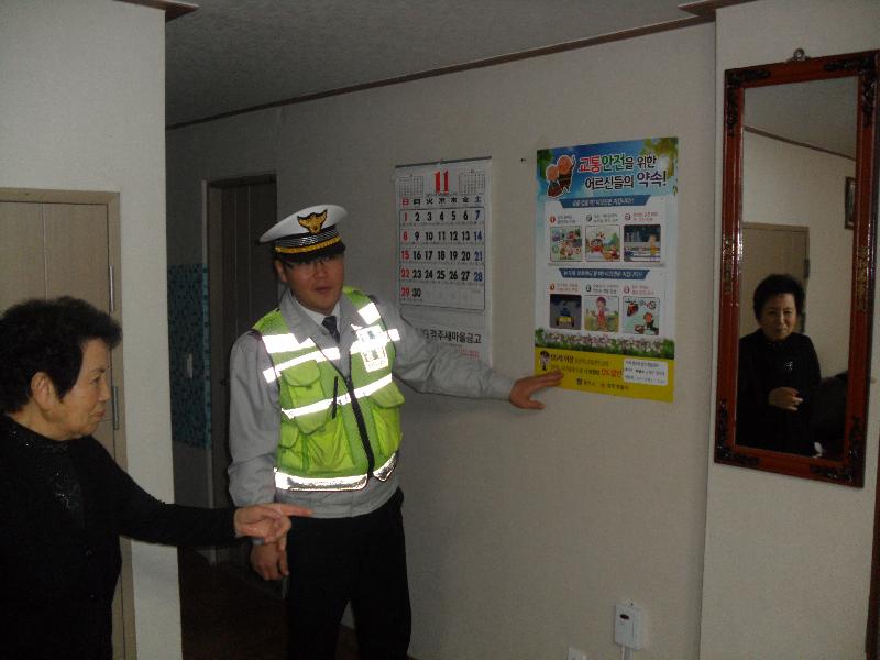이 홍보포스터는 노인 교통사고 예방을 위한 수칙을 만화형식으로 알기 쉽게 표현하였으며, 1警1老제에 따른 경로당 담당 경찰관의 연락처도 기재되어 있어 도움이 필요한 노인들이 언제든지 경찰관과 연락할 수 있도록 하였다. 한편, 경주경찰서는 노인 교통사고 예방을 위하여 11월 18일 10시 경주시 외동읍 소재 대한노인회 외동읍 지회에서 어르신들을 상대로 교통안전교육을 실시하였다. 이와 같이 찾아가는 교통안전교육은 지속적으로 실시되고 있으며, 아울러 1警1老제에 따라 모든 지역경찰관들이 월 2회 이상 관내 경로당을 방문하여 어르신들의 불편함을 살피고 홍보활동을 펼치는 등 교통사망사고 전국 1위 도시의 오명을 벗기 위해 적극적인 노력을 기울이고 있다.// 김희철 기자 khc4236@hanmail.net