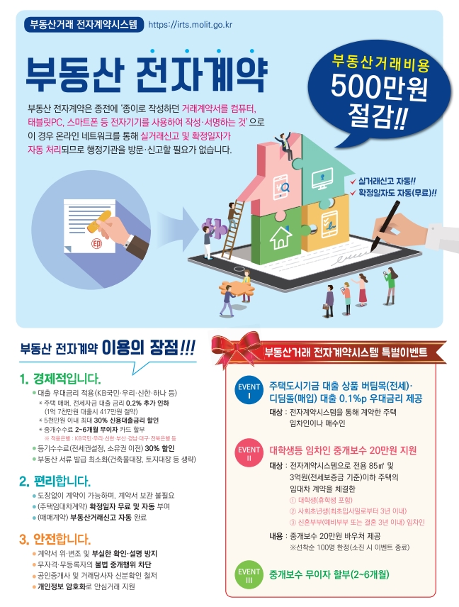 이를 통해 매매 계약을 체결할 경우 실거래가 신고가 자동으로 처리되고, 임대차 계약을 맺게 되면 확정일자 신청이 자동으로 처리돼 행정기관 방문 등의 번거로움을 줄일 수 있다.