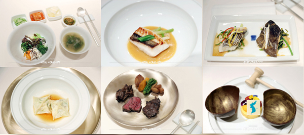 | 사진 왼쪽 위부터 시계방향으로 김해 봉하마을 쌀과 DMZ 산나물로 만든 비빔밥·쑥국, 부산 달고기구이, 도미찜과 메기찜, 디저트 망고무스(한반도의 봄), 서산 목장의 한우부위별 구이, 신안 민어해삼편수. (사진=남북정상회담 준비위원회) |