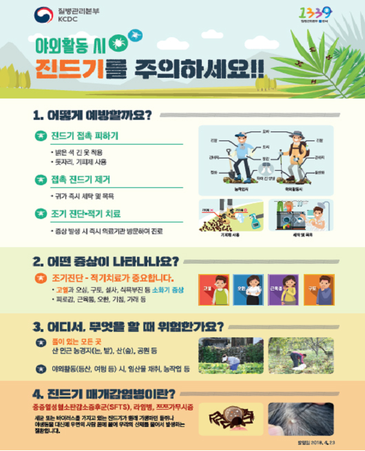 SFTS는 예방백신이나 치료제가 없어 야외활동을 할 때 진드기에 물리지 않는 것이 최선의 예방법이다.