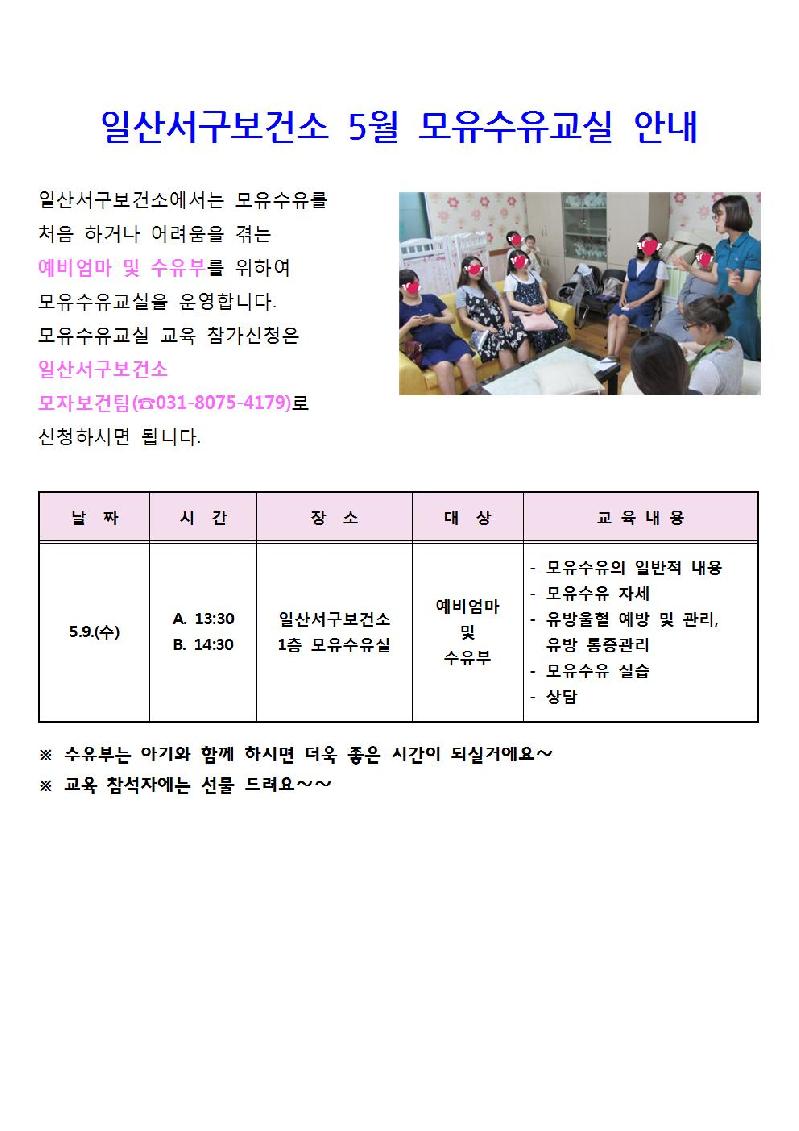 모유수유교실은 관내 임산부와 수유부를 대상으로 매월 둘째 주 수요일 오후 1시 30분부터 3시 30분까지 보건소 모유수유실에서 진행한다.