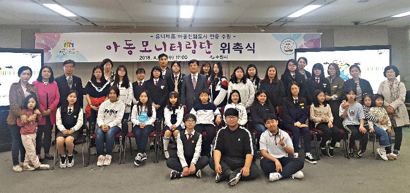 수원시는 25일 시청 중회의실에서 ‘2018년 아동 모니터링단’ 위촉식을 열고 청소년 43명에게 위촉장을 전달했다.