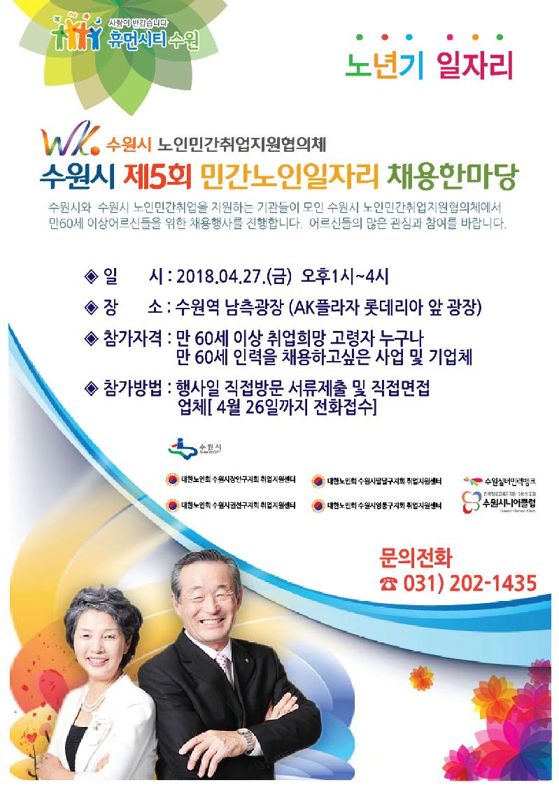 수원시는 오는 27일(금) 오후 1~4시 수원역 남측광장에서 만60세 이상 어르신을 위한 일자리박람회 ‘제5회 민간 노인일자리 채용 한마당’을 개최한다.