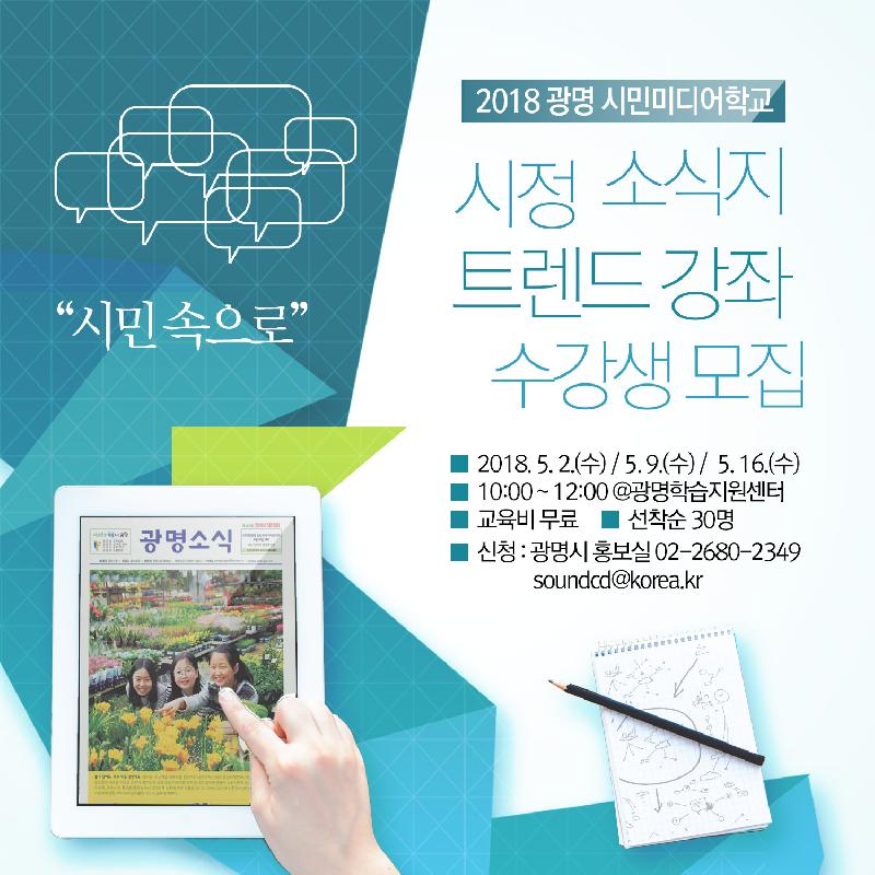 광명시에서 발행하는 미디어에 시민 참여를 확대하기 위해 마련한 시민미디어학교 1차 강좌는 ▶5월 2일 ‘읽는 신문에서 보는 신문으로’(디자인소호 이인기 대표) ▶5월 9일 ‘시민 중심 지역신문’(옥천신문 이안재 이사) ▶5월 16일 ‘동네잡지의 지역경제 활성화’(스트리트h 정지연 편집장) 등 3강으로 구성했다.