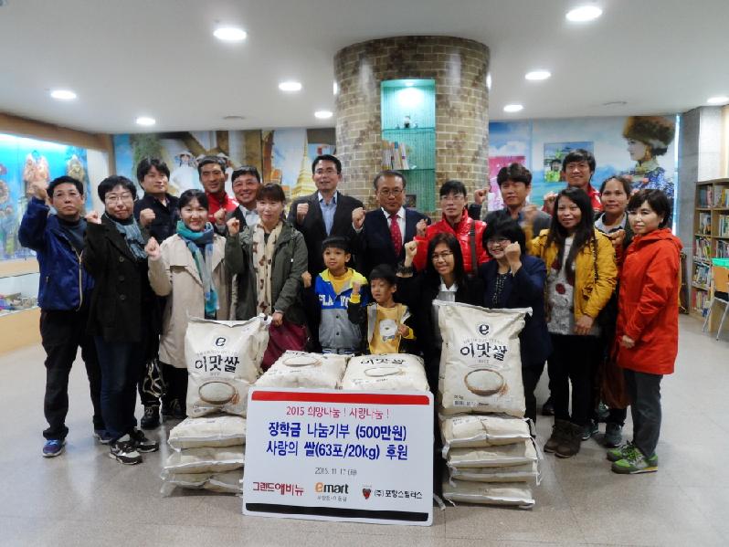 포항시다문화가족지원센터(센터장 윤영란 여성가족과장)는 17일 ㈜포항스틸러스와 이마트(이동점, 포항점), 그랜드애비뉴가 경제적으로 어려움을 겪고 있는 관내 다문화가정에 장학금 500만원과 백미 20kg 63포를 전달했다고 밝혔다. 이번 후원금 전달은 지난 6월 27일 포항 스틸야드 경기장에서 진행됐던 다문화가정 후원 협약을 통해 이뤄졌다. 협약에 따라 이마트(포항점, 이동점)는 스틸러스 선수들이 경기에서 한골을 넣을 때마다 20kg 백미 3포를 후원해 그동안 적립된 쌀을 저소득 다문화가정을 후원하게 됐으며, 그랜드 애비뉴는 10가정에 50만원씩 장학금을 지원하게 됐다. 이번에 장학금을 지급받게 된 일본 결혼이민여성 다카다요시애 씨는 “남편이 실직해 두 아이를 키우기가 힘들었는데 도움을 줘 감사하다”고 말했다. 이점식 복지환경국장은 “어려운 경기 속에서도 다문화가정에 지속적으로 도움을 주는 포항스틸러스, 이마트, 그랜드애비뉴에 감사드린다”며 “앞으로도 어려운 환경에 처한 다문화가족들이 한국생활에 잘 정착하도록 따뜻한 사랑과 관심을 가져주시길 바란다”고 말했다. 한편 ㈜포항스틸러스와 이마트(이동점, 포항점), 그랜드애비뉴는 지난 6월 27일에도 600만원의 장학금과 백미 20kg 45포를 전달한 바 있다.