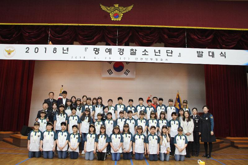 인천남부경찰서(서장 김상철)는 26일, 경찰서 4층 대강당에서 학익초등학교 등 관내 5개교 36명의 초등학생이 참여한 가운데 ‘2018년 명예경찰소년단 발대식’을 개최했다.