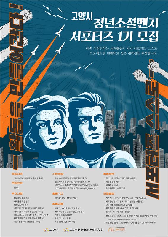 고양시와 고양지식정보산업진흥원(원장 양유길) 고양시사회적경제지원센터(이하 지원센터)는 『고양시 청년 소셜 벤처 서포터즈 1기』 모집 신청서를 27일부터 5월 25일(금)까지 접수한다.