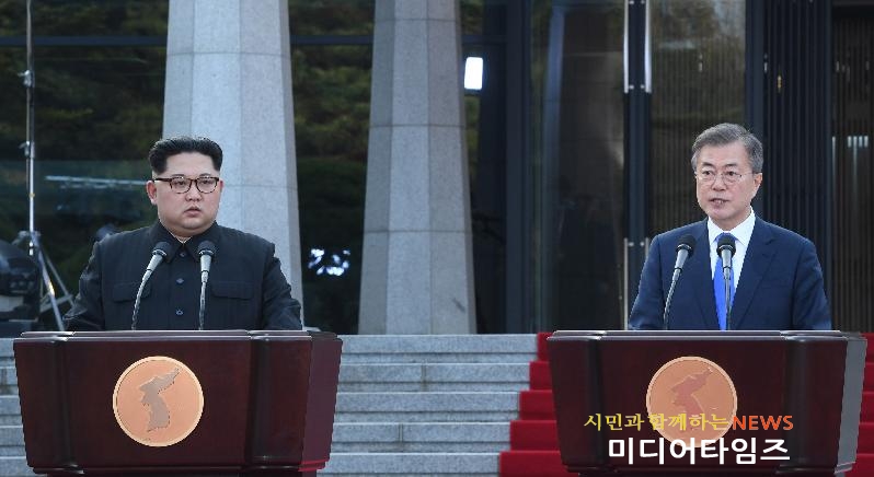 | 2018 남북정상회담이 열린 27일 경기도 파주시 판문점 평화의집 앞에서 문재인 대통령과 김정은 국무위원장이 "판문점 선언"을 발표하고 있다. |