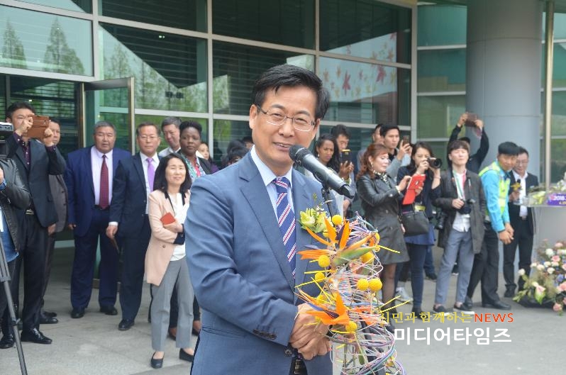 | 최성 시장이 27일 일산 호수공원에서 열린 "2018 고양국제꽃박람회"에서 인사말을 하고 있다. <사진=저작권자 ⓒ미디어타임즈> |