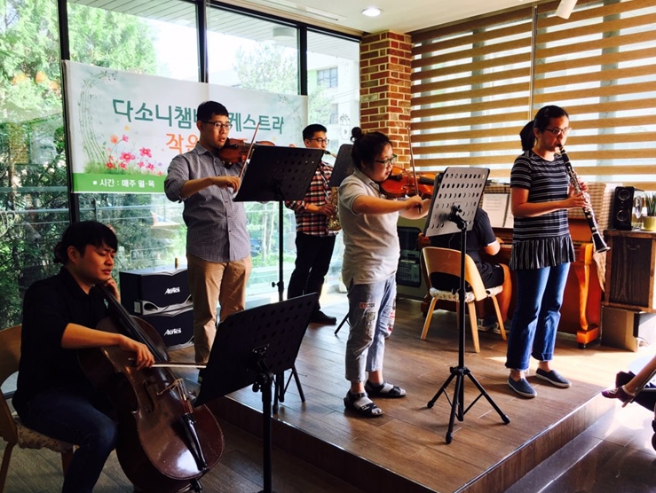 | 다소니챔버오케스트라 단원이 행복나눔일자리사업 일환으로 작은 음악회를 하고 있다. <사진=광명시청 제공> |
