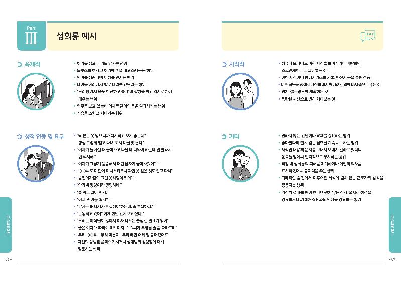 성희롱은 신체 접촉, 성적 언동·요구 등이 있다. 안마를 해준다며 어깨를 만지는 행위, “우리는 여직원이 많아서 여자 나오는 술집 갈 필요가 없어”“딱 붙은 옷 입으니까 섹시하고 보기 좋은데?”와 같은 언행, 야한 사진·농담을 모바일 메신저로 전송하는 행위, 원치 않는 만남·교제를 강요하는 행위 등이다.