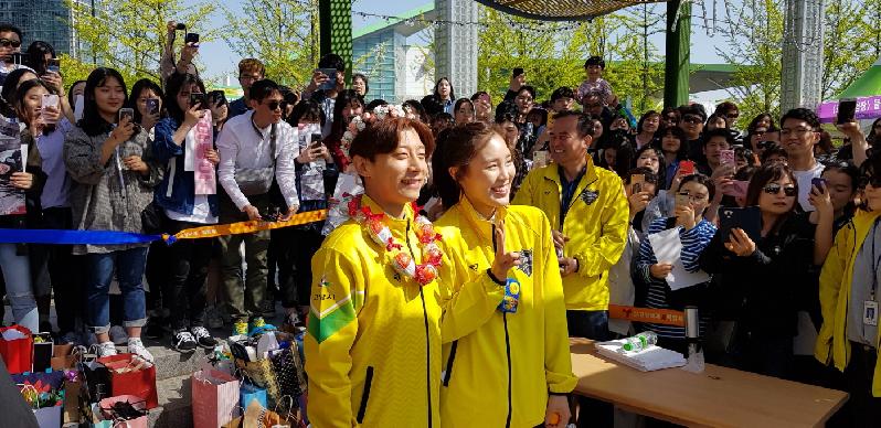 | 김아랑, 곽윤기 선수가 꽃박람회장에서 열린 팬사인회에 참석모습.<사진=고양시청 제공> |