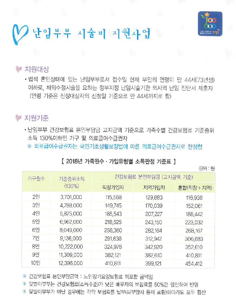 지원 대상은 법적 혼인상태에 있는 난임부부로서 접수일 현재 부인의 연령이 만44세 이하로 체외수정시술을 요하는 정부지정 난임시술기관 의사의 난임진단서를 제출한 자 중 건강보험료 기준중의소득 130% 이하인 가구 및 의료급여수급권자다.