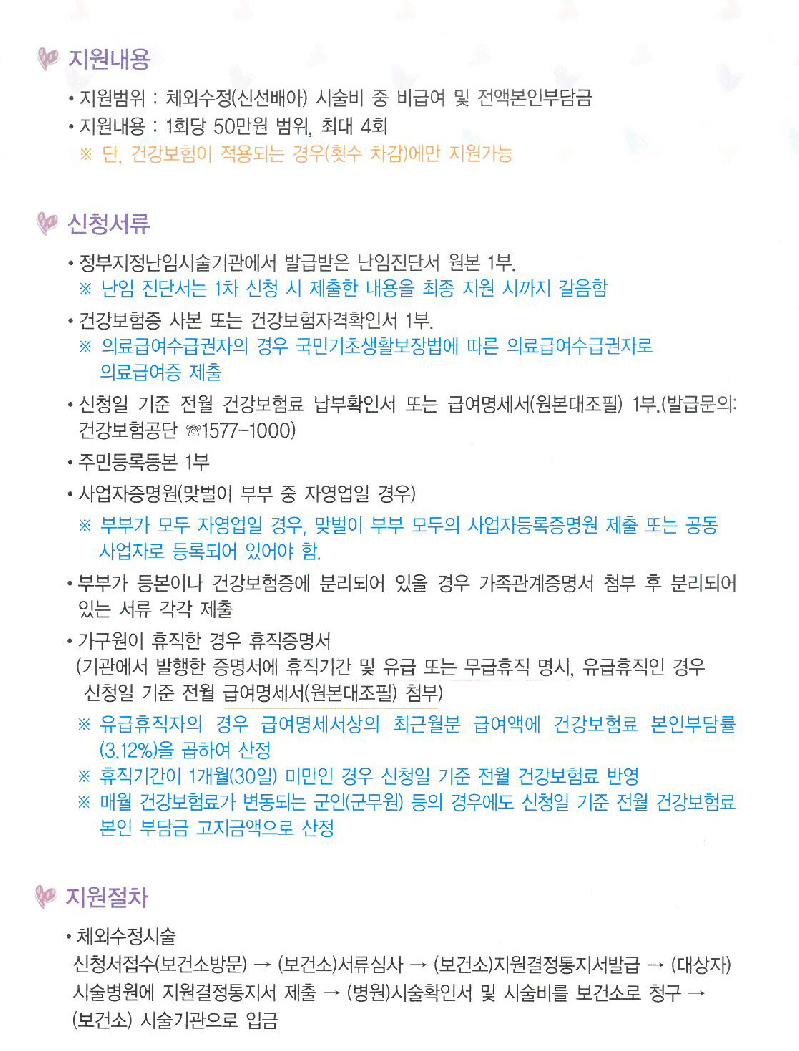 고양시 각 구 보건소는 저소득층 난임 부부를 대상으로 체외수정(신선배아) 시술비용을 최대 50만 원까지 지원한다.