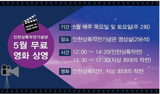 인천광역시는 가정의 달을 맞아 5월 매주 목요일과 토요일에 인천상륙작전기념관에서 영화‘인천상륙작전’과 ‘지상 최대의 작전’을 무료 상영한다.