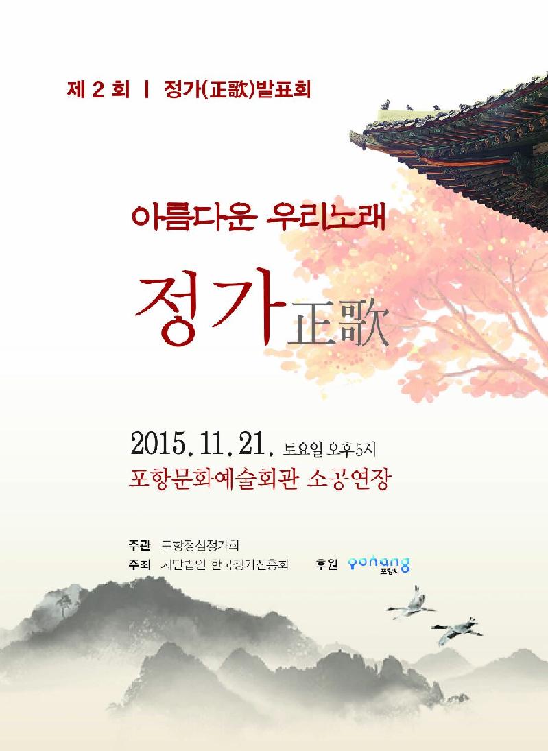 포항정심정가회(浦項正心正歌會)가 주관하는 ’제2회 정가발표회’가 21일 오후 5시 포항문화예술회관 소공연장에서 열린다. 우리 전통의 얼과 문화의 향기가 담겨있는 ‘아름다운 우리 노래, 정가(正歌)’는 가곡(歌曲), 가사(歌詞), 시조(時調)를 아우르는 이름이다. 특히 가곡은 ‘만년장환지곡(萬年長歡之曲)’이라고 하며 역사적으로 신라의 향가(鄕歌)와 맥락을 같이하고, 고려 가요(歌謠)와 조선조의 선비들의 풍류(風流)문화로 이어오는 우리 노래이다. 가곡은 지난 2010년 11월 16일 유네스코에서 세계무형문화재로 등재됨으로써, 역사성과 전통성에서 우리 문화의 우수함을 세계적으로 인정받았고, 이러한 높은 문화의 힘은 민족의 긍지와 문화적 자부심을 갖게 되는 계기가 되었다. 포항문화예술사업으로 포항시가 후원하고, 한국정가진흥회 주최하는 이번 공연은 가곡 이수자와 전수자들이 참여하고, 한국정가진흥회원들인 경상북도립국악단원과 대구시립국악단원들의 지원으로 우리 지역의 문화적 수준과 긍지를 높여 우리의 얼을 지키고, 공감(共感)하고 소통(疏通)하는 시민의 문화 행복감을 높여 우리 문화의 자긍심을 높이는 데 기여할 계획이다.