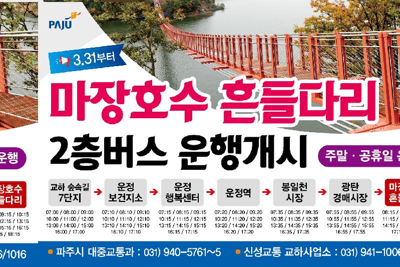 마장호수흔들다리 2층버스는 운행 한 달 이용승객이 약 6천명으로 매우 많아 입석승객 발생 및 증차요구가 지속 발생했으며 파주시에서는 모니터링 및 현장점검을 통해 2층 버스 추가 증차를 결정했다. 그러나 2층 버스 추가 증차를 위해 차량 준비, 기사교육 등 준비기간이 필요해 이번 연휴기간까지 도입이 불가능해 연휴기간 승객 안전을 위해 임시로 1층 버스 투입을 결정했다.